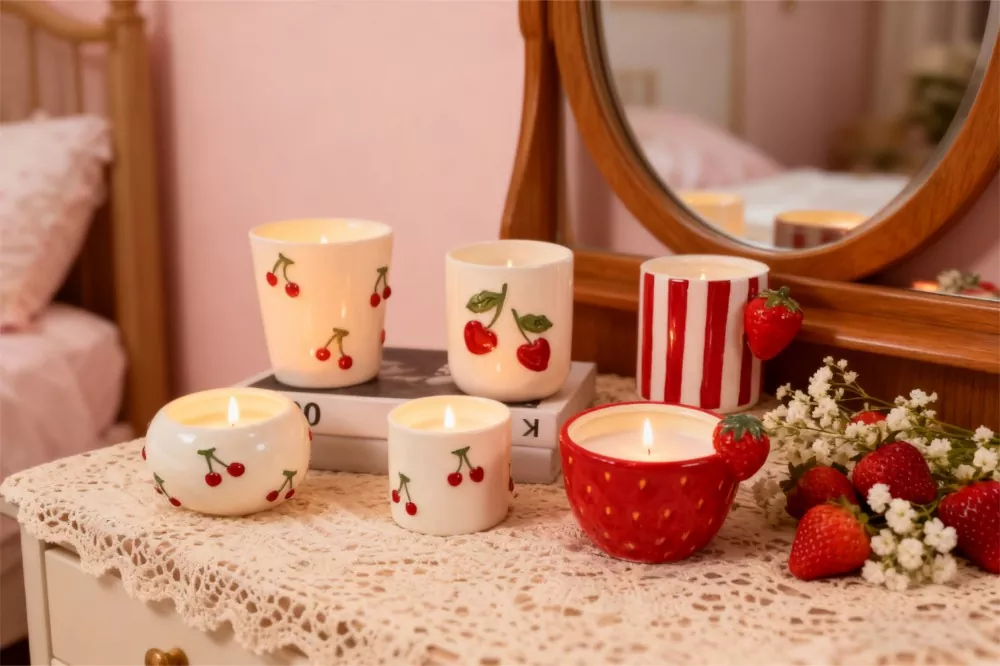 BYF-ren Zeramikazko Kandelen Jarri Super Adorable serieak goi-mailako eskuz egindako zeramikazko kandela poteak ditu, diseinu estilo "super polita" dutenak. Diseinuek elementu gozo klasikoak biltzen dituzte, hala nola gerezi gorriak, hiru dimentsioko lazoak eta marrubiak, glaze leuna eta forma anitzak dituztenak. Material seguru eta ingurumena errespetatzen dutenez egina, beroarekiko erresistentzia bikaina du eta ezin hobeto egokitzen da metxe estandarrekin eta argizarizko hainbat oinarri, kalitate handiko kandelen edukiontzia eta etxeko dekorazioa hobetzen duen apaingarri artistikoa.